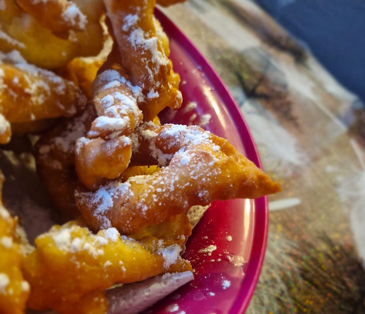 Sur la feuille à pâtisserie, étaler la pâte sur environ 5 mm d’épaisseur. Découper des rectangles et faire une entaille au centre. Passer une extrémité dans l’entaille pour former les bugnes.